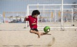 Seorang anak laki-laki berusaha mengontrol bola saat berlatih sepak bola di pantai Ipanema, Rio de Janeiro, Brasil, Rabu (7/5). (AP/Hassan Ammar)