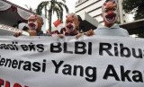 Sejumlah massa berunjuk rasa menuntut penuntasan kasus BLBI di depan Gedung Komisi Pemberantasan Korupsi (KPK), Jakarta, Senin (12/5). (Republika/Aditya Pradana Putra)