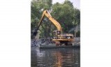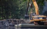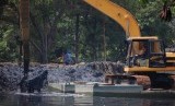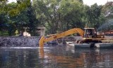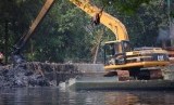 REPUBLIKA.CO.ID, JAKARTA -- Sebuah alat berat mengeruk lumpur di kedalaman sungai Plumpang, Jakarta Utara, Senin (12/5).