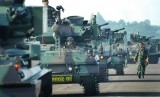 Sejumlah prajurit TNI berada di atank bersiap meninggalkan lapangan usai mengikuti pembukaan upacara pembukaan latihan gabungan (latgab) TNI, di Skuadron 17 Landasan Udara Halim Perdanakusuma, Jakarta Timur, Senin (19/5). (Republika/Rakhmawaty La'lang)