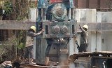 REPUBLIKA.CO.ID, JAKARTA -- Sejumlah pekerja dengan menggunakan alat berat memasang turap di proyek pembangunan drainase Sungai Ciliwung, Jalan Gunung Sahari Raya, Jakarta Pusat, Selasa (20/5).