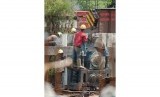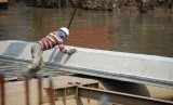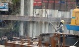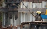 Pekerja memasang turap di proyek pembangunan drainase Sungai Ciliwung, Jalan Gunung Sahari Raya, Jakarta Pusat, Selasa (20/5). (foto: Raisan Al Farisi)