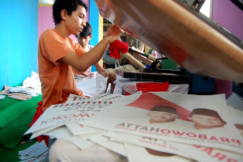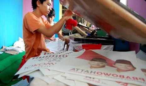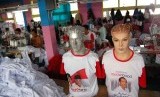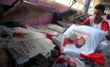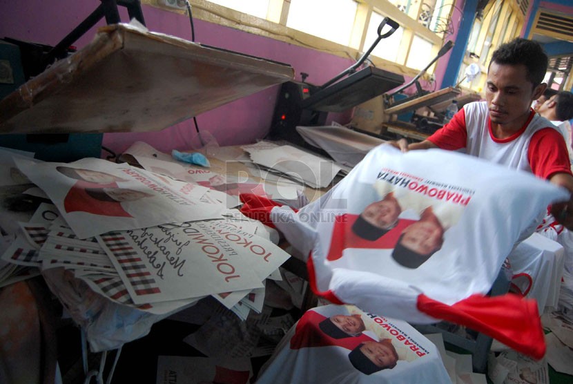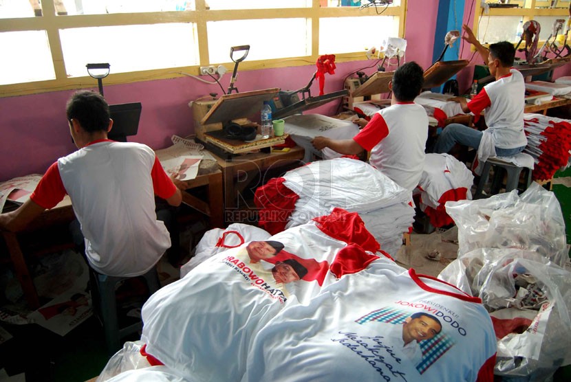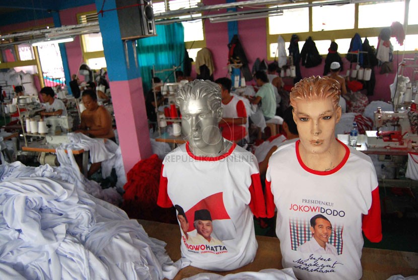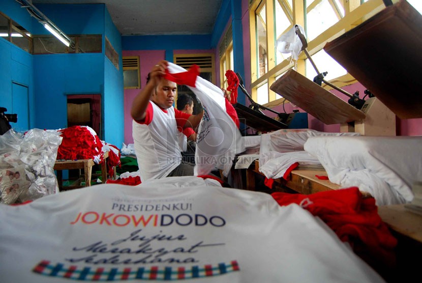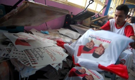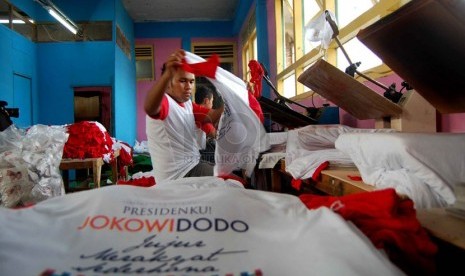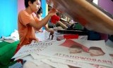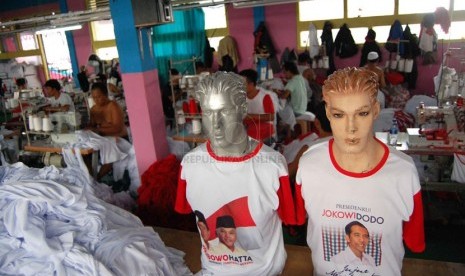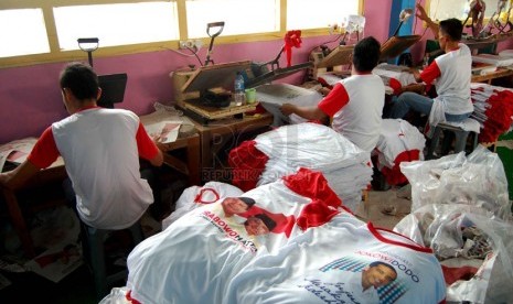 REPUBLIKA.CO.ID, JAKARTA -- Pekerja menyelesaikan pembuatan kaos untuk kampanye calon presiden dan wakil presiden di pabrik konveksi kawasan Bukit Duri, Tebet, Jakarta Selatan, Rabu (4/6).