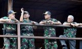 Menhan Purnomo Yusgiantoro (kanan), Panglima TNI Jenderal TNI Moeldoko (kedua kiri), Kasal Laksamana TNI Dr. Marsetio (kiri), dan Kasau Marsekal TNI Ida Bagus Putu Dunia (kedua kiri) memantau latihan operasi darat gabungan di Situbondo, Rabu (3/6). (Repub
