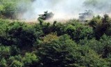 Ledakan timbul akibat ranjau dalam latihan operasi darat gabungan di Pusat Latihan Pertempuran Marinir V Baluran, Asembagus, Situbondo, Jawa Timur, Rabu (3/6). (Republika/Aditya Pradana Putra)