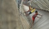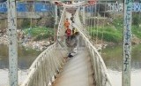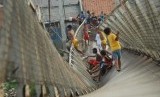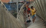REPUBLIKA.CO.ID, JAKARTA -- Sejumlah anak melintasi jembatan gantung miring yang melintang di atas Kanal Banjir Barat di kawasan Grogol petamburan, Jakarta Barat, Kamis (12/6).