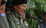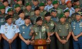 Panglima TNI Jenderal Moeldoko bersama jajaran staf petinggi TNI memberikan keterangan pers usai rapat koordinasi keamanan jelang pilpres di Mabes TNI, Cilangkap, Jakarta, Jumat (13/6). (Republika/Rakhmawaty La'lang)