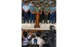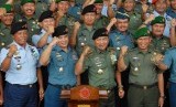 REPUBLIKA.CO.ID, JAKARTA -- Panglima TNI Jenderal Moeldoko bersama jajaran staf petinggi TNI memberikan keterangan pers usai rapat koordinasi keamanan jelang pilpres di Mabes TNI, Cilangkap, Jakarta, Jumat (13/6).