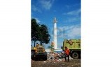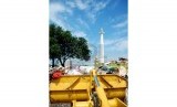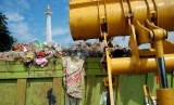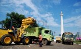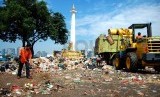 REPUBLIKA.CO.ID, JAKARTA -- Petugas menggunakan alat berat untuk membersihkan dan mengangkut sampah yang menumpuk di pelataran Monumen Nasional, Jakarta Pusat, Senin (16/6).