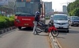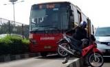 Pengendara mengangkut motornya keluar dari jalur busway saat Polisi menggelar razia di jalan MT. Haryono, Jakarta Timur, Selasa (24/6). (foto : Raisan Al Farisi)