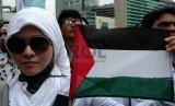 Demonstran dari Forum Silaturahmi Lembaga Dakwah Kampus (FSLDK) dan elemen masyarakat melakukan aksi simpatik di Bundaran HI,Jakarta, Jumat (11/7). (Republika/ Tahta Aidilla). (FOTO : Republika/ Tahta Aidilla)