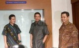 Koordinator ICW Ade Irawan (kiri) menyambut Menteri Agama, Lukman Hakim Saifuddin (tengah) dan Dirjen Penyelenggaraan Haji dan Umroh, Abdul Jamil (kanan) saat berkunjung ke Kantor ICW, Jakarta, Selasa (15/7). (Republika/Agung Supriyanto) (FOTO : Republika/Agung Supriyanto)