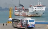 Sejumlah penumpang menaiki kapal roro-roro yang akan bersandar di Pelabuhan Merak, Banten, Ahad (20/7).( Republika/Prayogi)