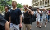 Sejumlah Warga Negara Asing (WNA) asal Tiongkok dan Taiwan digiring petugas usai menjalani pemeriksaan di Mabes POLRI, Jakarta Selatan, Senin (21/7). (Republika/Rakhmawaty La'lang)