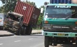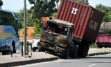 REPUBLIKA.CO.ID, PALIMANAN -- Truk kontainer berhenti di tengah pembatas jalan usai menabrak tiang listrik di ruas Jalan Palimanan-Indramayu, Jawa Barat, Selasa (22/7).