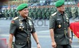 Mantan KSAD Jenderal TNI Budiman (kiri) dan KSAD Letjen TNI Gatot Nurmantyo berjalan usai upacara serah terima jabatan KSAD di Mabes TNI AD, Jakarta, Jumat (25/7). (Republika/Aditya Pradana Putra)