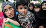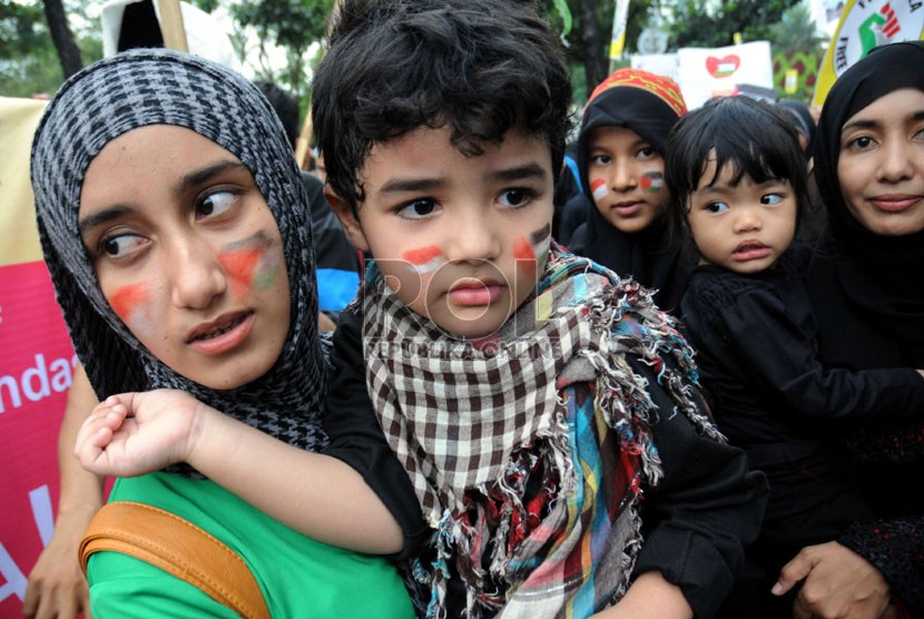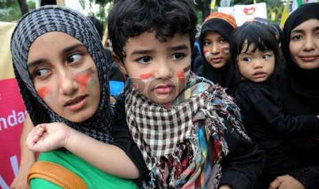 Kalangan ibu dan anak ikut serta dalam aksi menentang agresi Israel di depan Kedubes Amerika Serikat (AS), Jakarta, Jumat (25/7). (Republika/Aditya Pradana Putra)