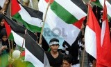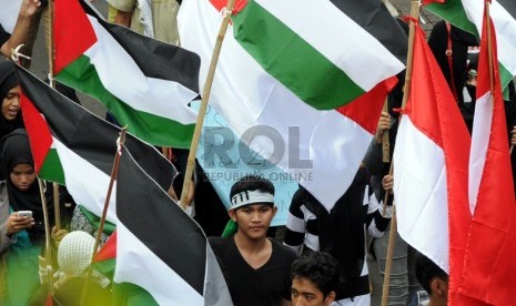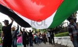 Pengunjuk rasa membawa bendera Palestina raksasa saat unjuk rasa beberapa organisasi muslim di depan Kedubes Amerika Serikat (AS), Jakarta, Jumat (25/7). (Republika/Aditya Pradana Putra)