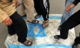 Pengunjuk rasa menginjak bendera Israel saat berdemonstrasi di Jalan MH Thamrin, Jakarta, Jumat (25/7). (Republika/Aditya Pradana Putra)