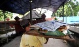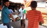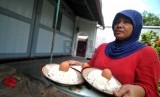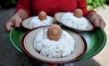 Warga membawa ancak berisi nasi bersama telur ayam untuk dibagikan ke tetangga di Kampung Trusmi, Cirebon, Jawa Barat, Ahad (27/7). (Republika/Wihdan)