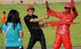 Pengunjung berfoto dengan manusia patung saat berwisata di Monumen Nasional (Monas) di Jakarta, Selasa (29/7). (Republika/Aditya Pradana Putra)
