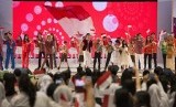 Sejumlah anak dan artis pendukung menyanyikan lagu Bendera pada acara puncak Peringatan Hari Anak Nasional Tahun 2014 di Gedung Sasana Kriya, TMII, Jakarta Timur, Rabu (6/8). (Antara/Widodo S. Jusuf)