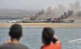 REPUBLIKA.CO.ID, DENPASAR -- Dua nelayan menyaksikan upaya pemadaman api yang melalap dua kapal ikan di Pelabuhan Benoa, Denpasar, Bali, Rabu (6/8).