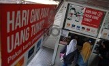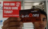 Calon penumpang menujukkan kartu E-Money di halte Harmoni, Jakarta Pusat, Selasa (12/8). (Republika/Rakhmawaty La'lang)