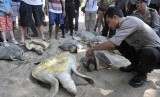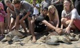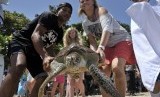 REPUBLIKA.CO.ID, KUTA -- Wisatawan dan relawan mengangkat penyu hijau (Chelonia Mydas) saat pelepasan kembali binatang langka itu di Pantai Kuta, Bali, Rabu (13/8).