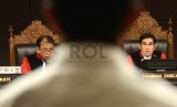Ketua Majelis Hakim Mahkamah Konstitusi (MK) Hamdan Zoelva (kanan) mendengarkan keterangan saksi dari pihak terkait pada sidang lanjutan Perselisihan Hasil Pemilihan Umum (PHPU) Pilpres 2014 di Gedung MK, Jakarta, Kamis (14/8). (Republika/Agung Supriyanto