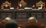 Ketua Majelis Hakim Mahkamah Konstitusi (MK) Hamdan Zoelva (tengah) mendengarkan keterangan saksi dari pihak terkait pada sidang lanjutan Perselisihan Hasil Pemilihan Umum (PHPU) Pilpres 2014 di Gedung MK, Jakarta, Kamis (14/8). (Republika/Agung Supriyant