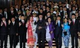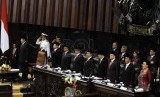 Presiden Susilo Bambang Yudhoyono didampingi jajaran petinggi DPR dan DPD bersiap mengikuti Sidang Bersama DPR dan DPD 2014 di Ruang Rapat Nusantara, Kompleks Parlemen, Senayan, Jakarta, Jumat (15/8). (Republika/Aditya Pradana Putra)