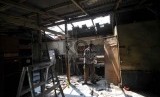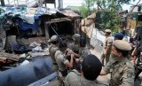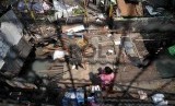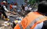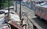 REPUBLIKA.CO.ID, JAKARTA -- Petugas membongkar bangunan di tepi rel  Stasiun Tebet, Jakarta, Senin (18/8).