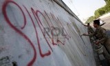 REPUBLIKA.CO.ID, JAKARTA -- Petugas Satpol PP membersihkan coretan di salah satu tembok Flyover Pasar Rebo, Jakarta Timur, Senin (18/8).