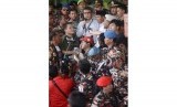 Juru Bicara Komisi Pemberantasan Korupsi (KPK) Johan Budi menemui massa dari berbagai organisasi massa yang berunjuk rasa didepan Gedung KPK, Jakarta, Senin (18/8). (Republika/Agung Supriyanto)