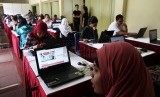 Peserta tes Calon pegawai Negeri Sipil (CPNS) melakukan simulasi tes secara online di kawasan Senayan, Jakarta, Rabu (20/8).(Republika/ Yasin Habibi) (FOTO : Republika/ Yasin Habibi)