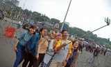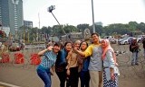 Warga berfoto selfie di depan pagar kawat Jalan Merdeka Barat, Jakarta Pusat, Kamis (21/8). (Republika/Raisan Al Farisi)