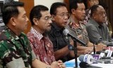 Menko Polhukam Djoko Suyanto (tengah) memberi keterangan pers usai rapat evaluasi pengamanan pilpres di Kantor Kemenko Polhukam Jakarta, Jumat (22/8). (Republika/ Yasin Habibi)