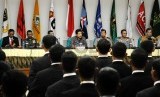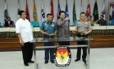 (dari kiri) Ketua Bawaslu Muhammad, Wakil Asisten Operasi Panglima TNI Laksamana Pertama TNI Darwanto, Ketua KPU Husni Kamil Manik, dan Kepala Satgas 5 Brigjen C Lembang di Gedung KPU, Jakarta, Jumat (22/8). (Republika/ Tahta Aidilla)
