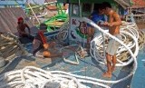 Sejumlah nelayan membenahi tali jangkar di kapalnya yang berlabuh di Pantai Utara kawasan Eretan, Indramayu, Selasa (26/8). (Republika/Raisan Al Farisi) (FOTO : Republika/Raisan Al Farisi)