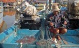 REPUBLIKA.CO.ID, INDRAMAYU -- Seorang nelayan, Rosid (31) mengisi waktu luang dengan menjahit jaring di kapalnya yang berlabuh di Pantai Utara kawasan Eretan, Indramayu, Selasa (26/8).