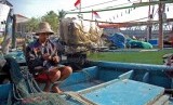 Seorang nelayan, Rosid (31) mengisi waktu luang dengan menjahit jaring di kapalnya yang berlabuh di Pantai Utara kawasan Eretan, Indramayu, Selasa (26/8)(Republika/Raisan Al Farisi) (FOTO : Republika/Raisan Al Farisi)
