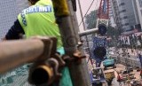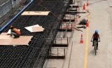 Pekerja naik sepeda melintasi proyek pembangunan Mass Rapid Transport (MRT) di kawasan Thamrin, Jakarta,Jumat (29/8) (Republika/Tahta Aidilla)