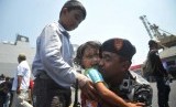 Seorang prajurit dari Satgas Rim of The Pacific (Rimpac) 2014 mencuim purtinya saat tiba di Dermaga Kolinlamil, Tanjung Priok, Jakarta Utara, Selasa (2/9). (Republika/Rakhmawaty La'lang)
