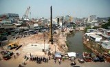 Setelah beberapa hari lalu bangunan dan ruko disekitar ditertibkan, kini proses pemasangan turap di Kali Ciliwung mulai dilaksanakan.