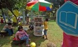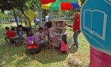 Sejumlah anak membaca buku saat penyuluhan Hidden Park di Ruang Terbuka Hijau (RTH) Taman Tanjung, Jakarta Selatan, Ahad (7/9). (Republika/Raisan Al Farisi)