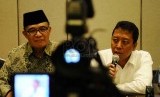 Wakil Ketua Umum DPP PPP Emron Pangkapi (kiri) selaku Pelaksana tugas (Plt) Ketua Umum, bersama Sekjen DPP PPP Romahurmuziy (kanan) saat konfrensi pers di Jakarta, Rabu (10/9). (Republika/Tahta Aidilla)