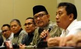 Wakil Ketua Umum DPP PPP Emron Pangkapi (kedua kanan) selaku Pelaksana tugas (Plt) Ketua Umum, bersama Sekjen DPP PPP Romahurmuziy (kanan) saat konfrensi pers di Jakarta, Rabu (10/9). (Republika/Tahta Aidilla)