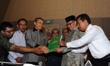 Ketua DPW PPP Provinsi Banten Muhammad Mardiono (ketiga kiri) menyerahan surat dukungan 28 DPW PPP kepada Wakil Ketua Umum DPP PPP Emron Pangkapi (kedua kanan) selaku Pelaksana tugas (Plt) Ketua Umum disaksikan Sekjen DPP PPP Romahurmuziy (kanan) di Jak