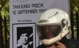 Seorang peserta melepas helm tak jauh dari baliho kasus Tanjung Priok sebelum dimulainya jumpa pers terkait peringatan 30 tahun peristiwa Tanjung Priok 12 September 1984 di kantor KontraS, Jakarta Pusat, Jumat (12/9). (Antara/Fanny Octavianus)